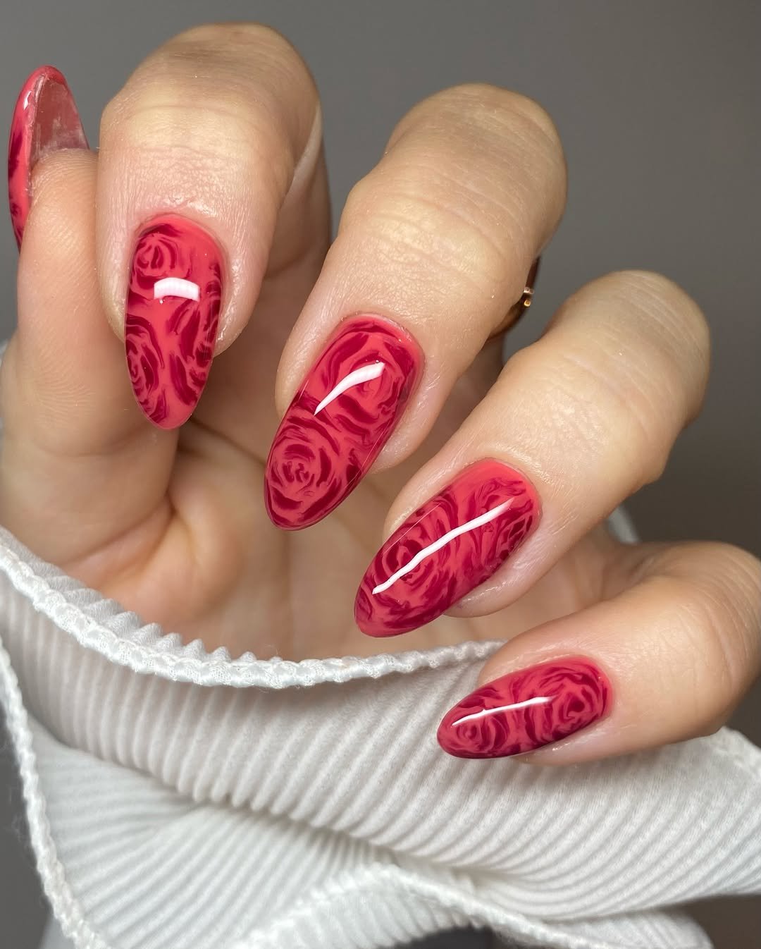The embossed rose pattern on these red nails brings a romantic, artistic vibe. The tone-on-tone detailing looks classy and feminine.