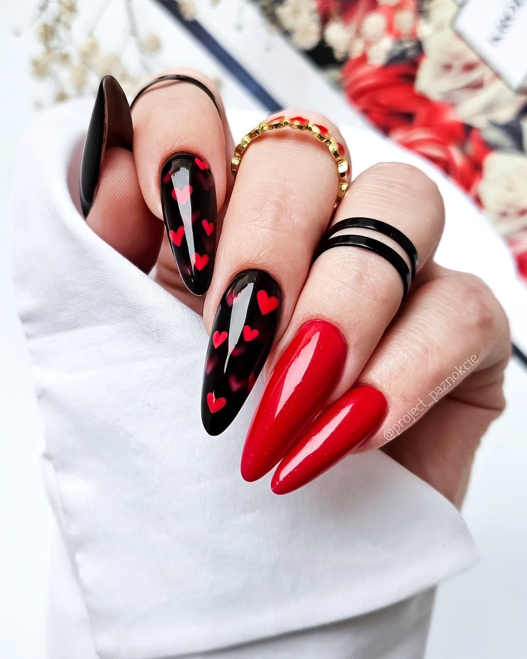 A bold fusion of red and black nails featuring tiny red hearts—a flirtatious, playful design. The contrast creates instant visual drama.