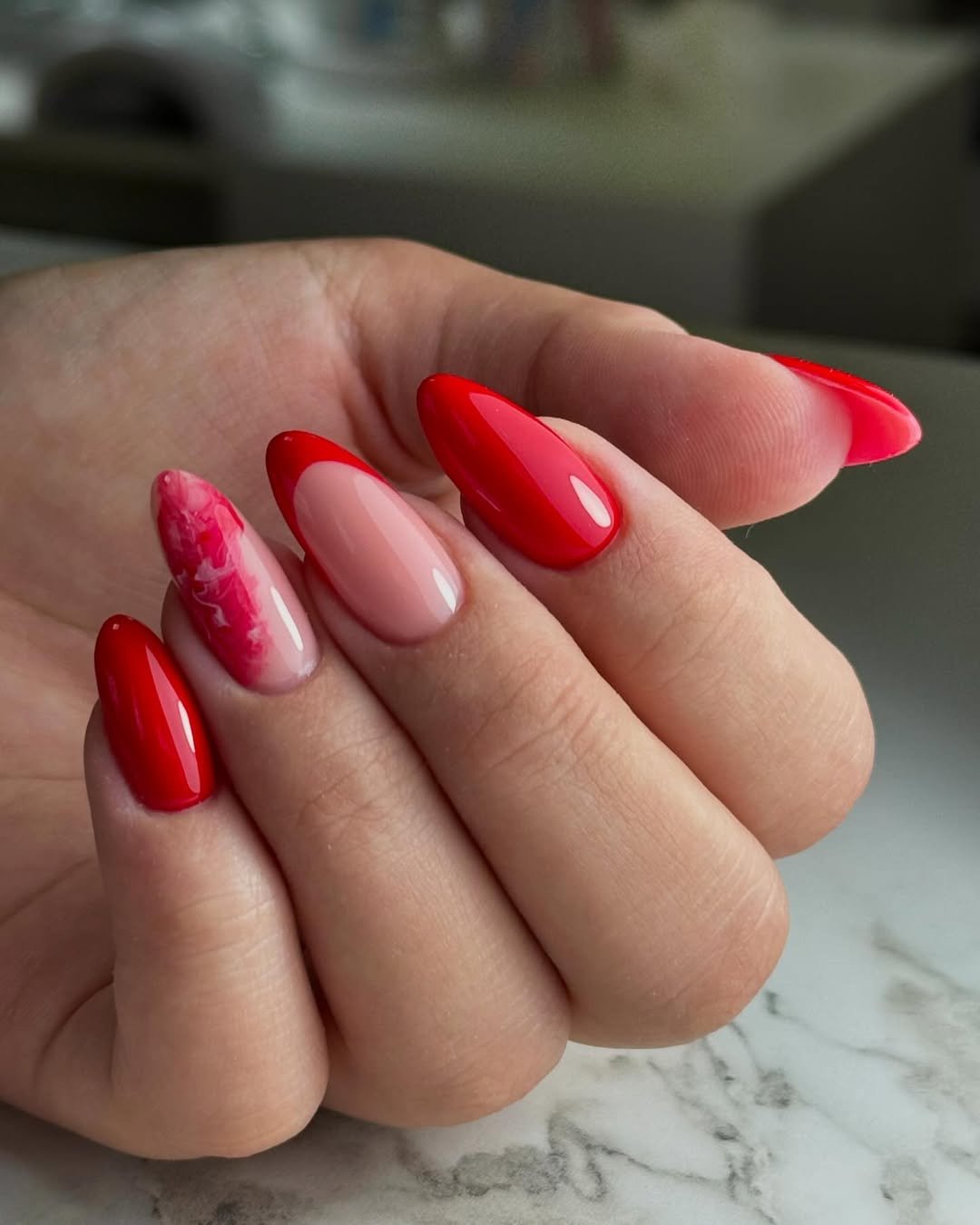 These nails combine glossy red and a soft pink marble design, offering elegance with a creative twist. The translucent marble accent feels light and airy.