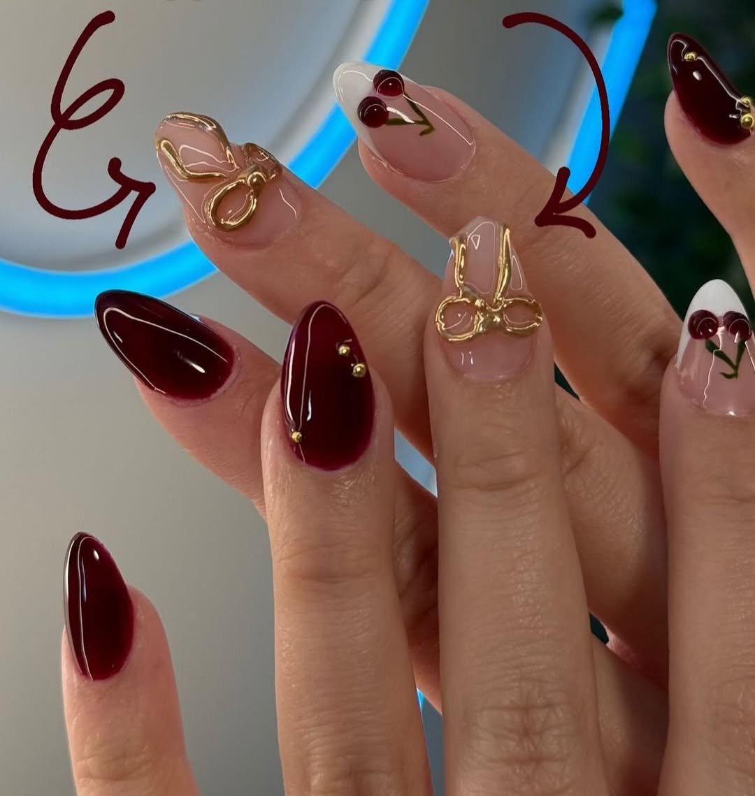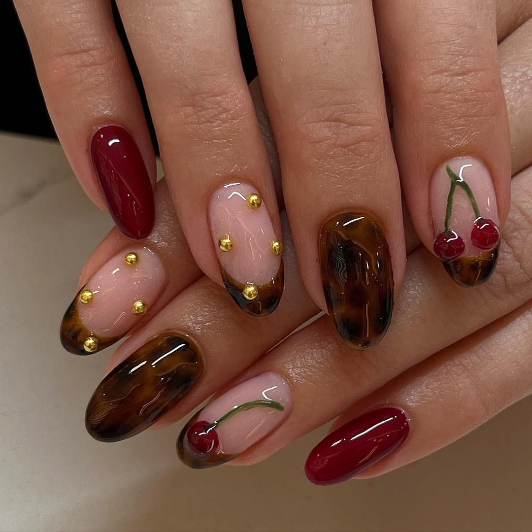 Red cherries and gold studs bring a touch of whimsy to this artistic manicure. The tortoiseshell base adds an unexpected earthy contrast.