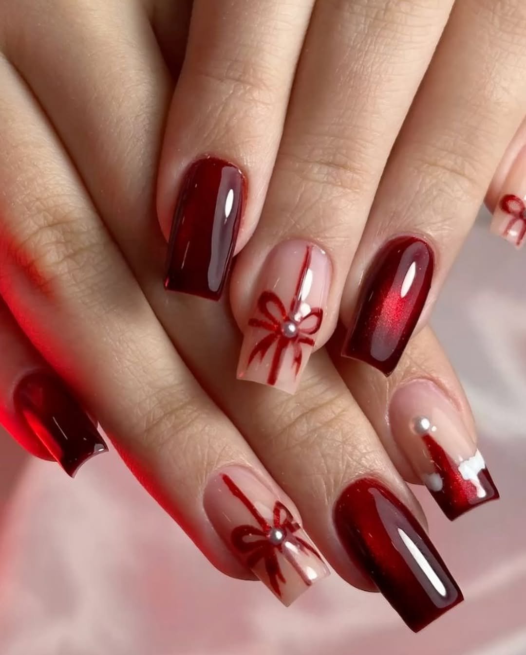 These nails, designed with delicate red ribbons and subtle pearls, are an ode to holiday cheer. The gradient effect from deep red to soft pink adds a warm glow.