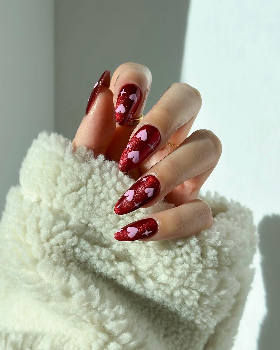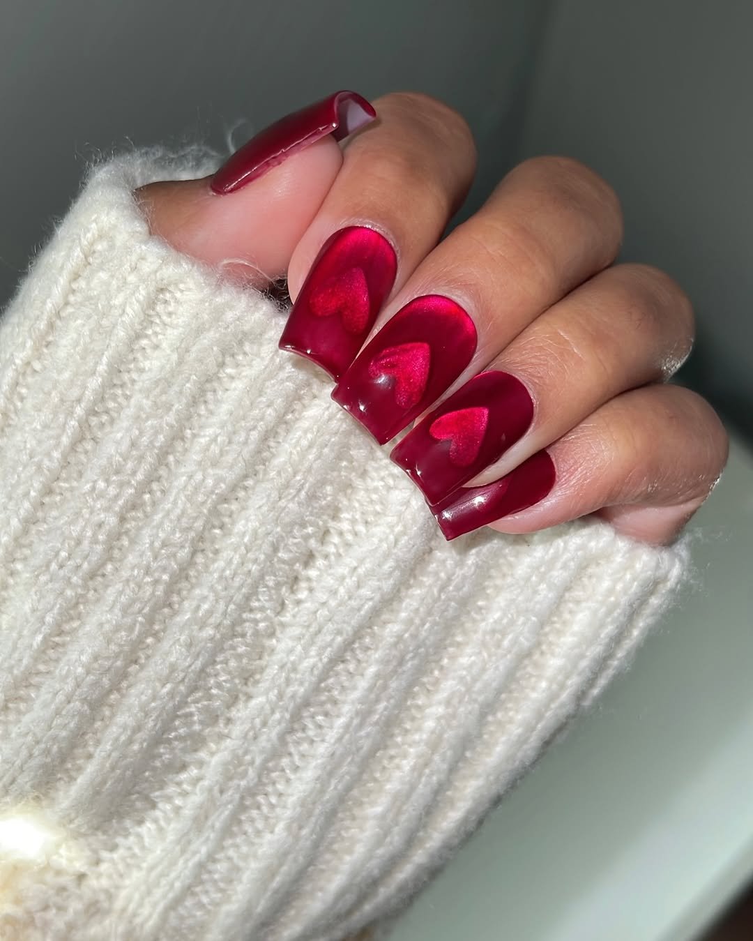 Soft, cozy, and full of love—these nails feature heart details over a burgundy base. The sweater backdrop makes them feel warm and inviting.