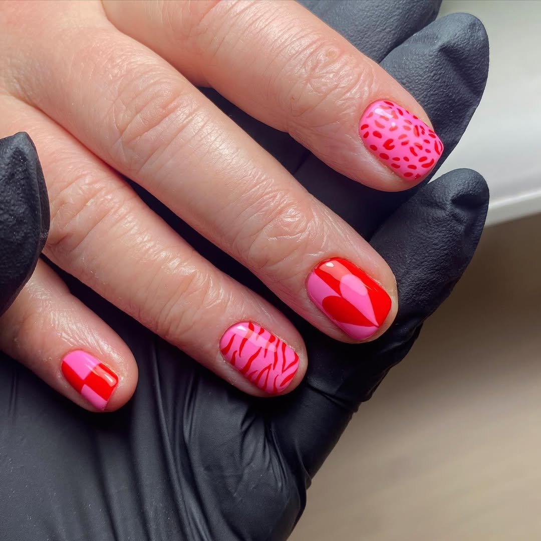 These short nails mix patterns—hearts, stripes, and animal prints—all in shades of red and pink. It’s quirky and full of personality.