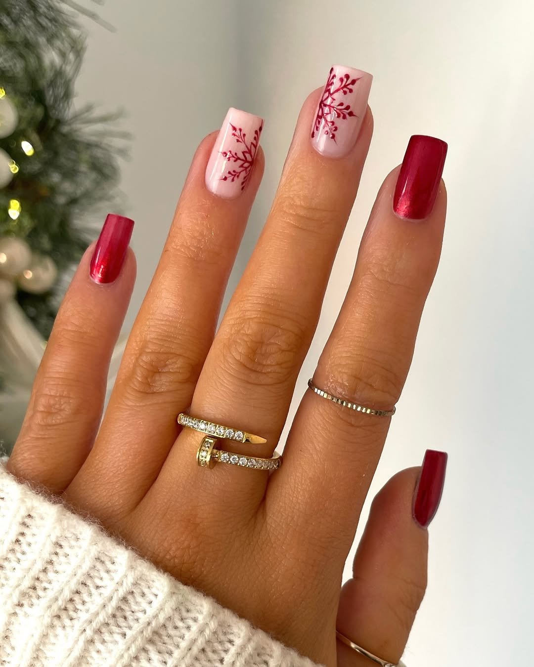 For a more festive effect, add silver glitter on a few tips or a frosty top coat. It’ll look like your nails are dusted with snow.