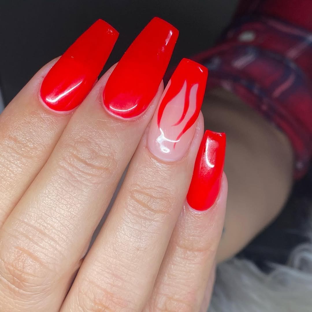Hot and fierce, this manicure features bright red flames over a nude base. It’s trendy, edgy, and eye-catching.