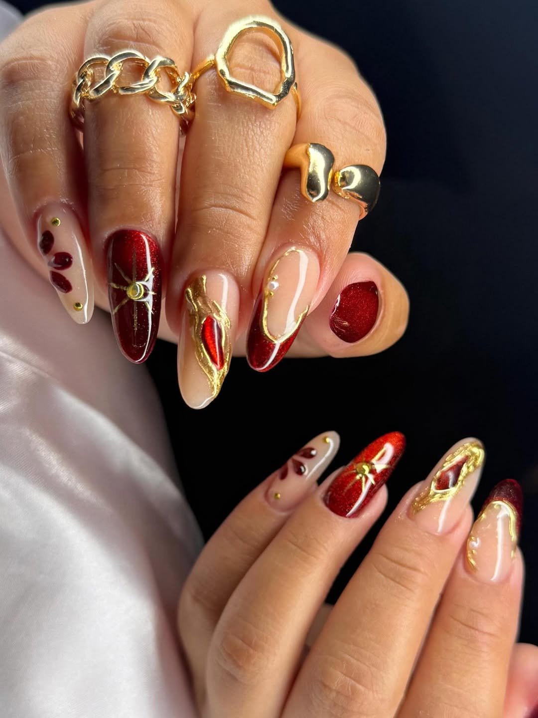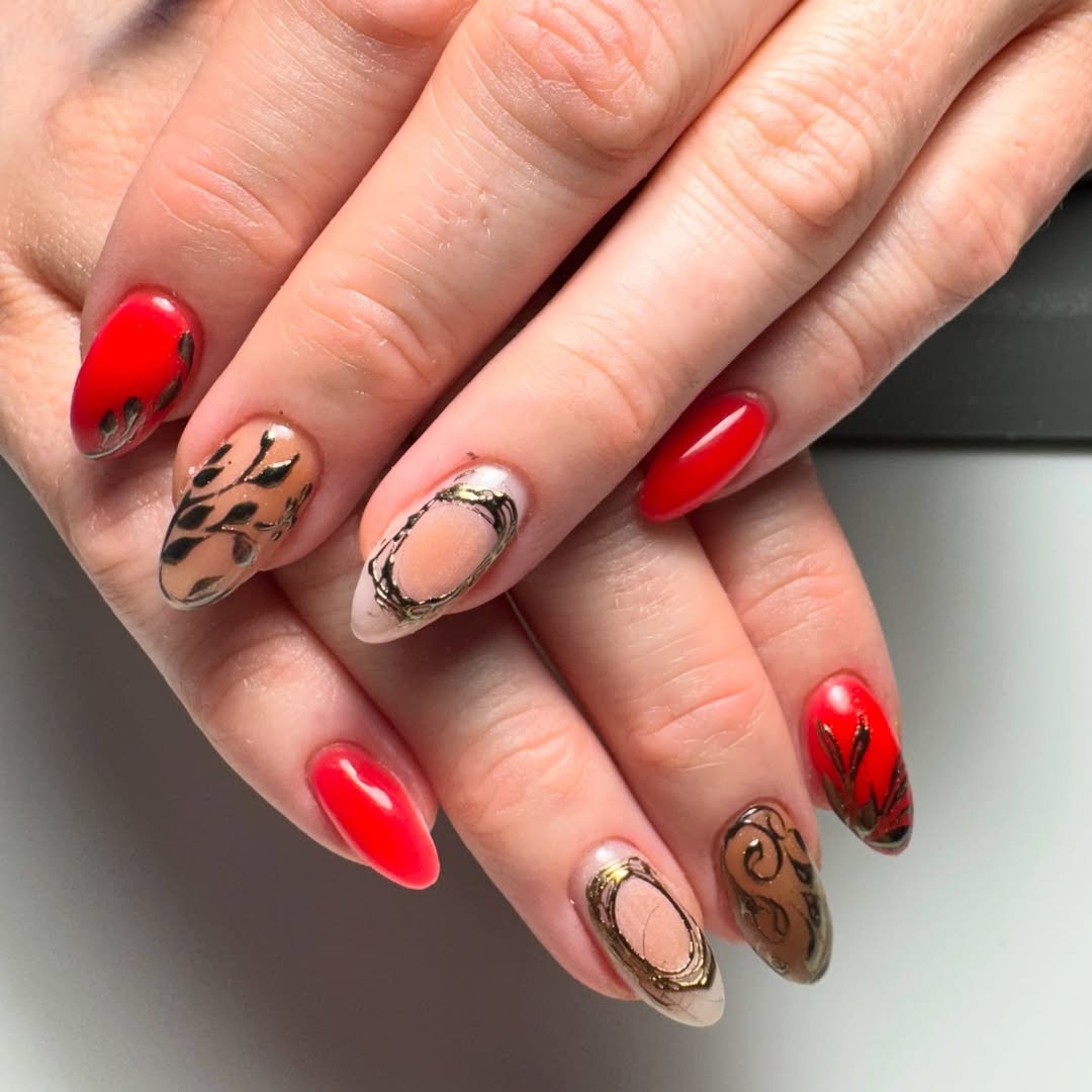 These nails play with nude, red, and black tones layered with metallic gold accents. The artistic swirls give them a painterly, high-fashion aesthetic.