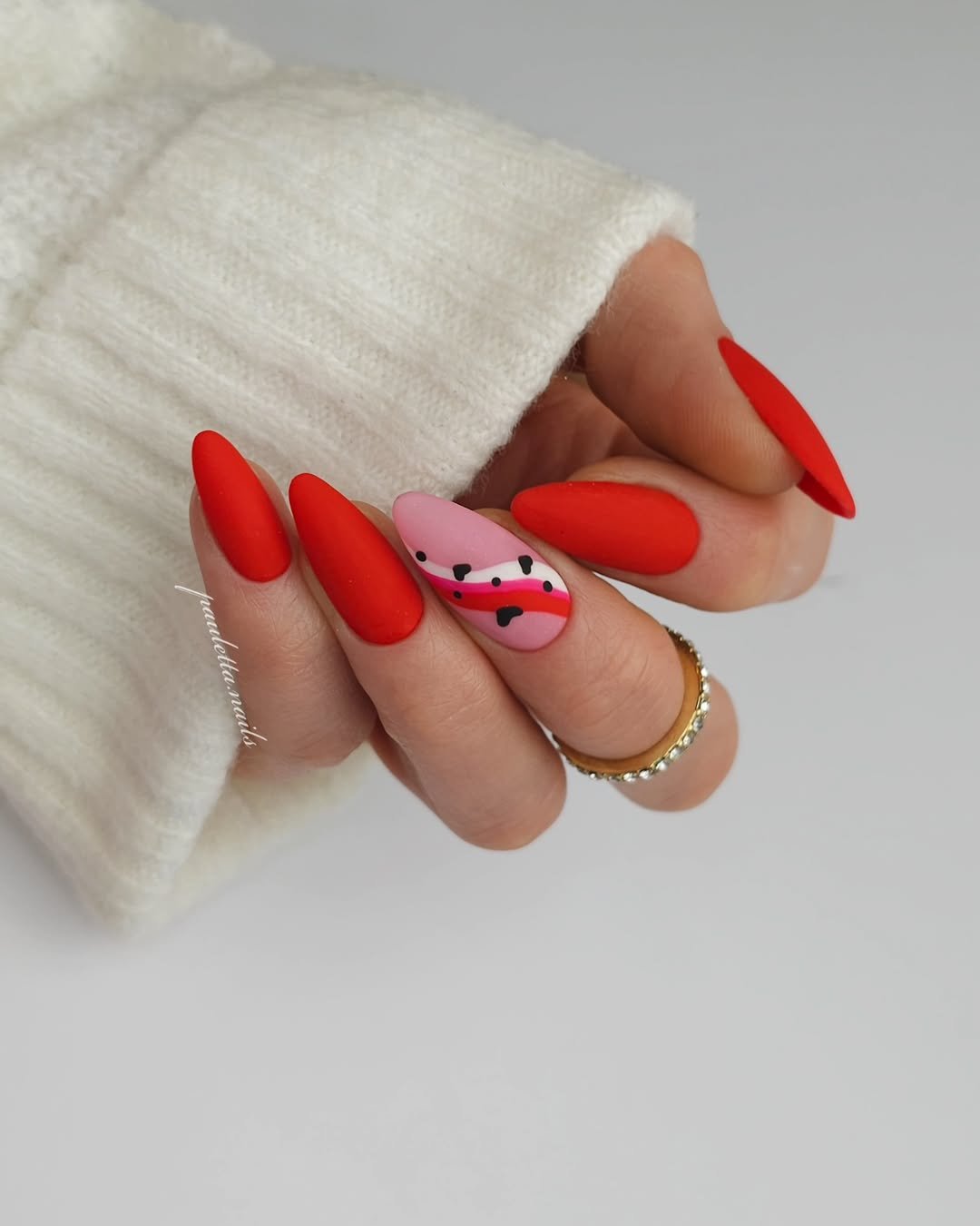 Matte red nails paired with a pink striped accent give a chic, playful twist. The black dots add dimension and personality.