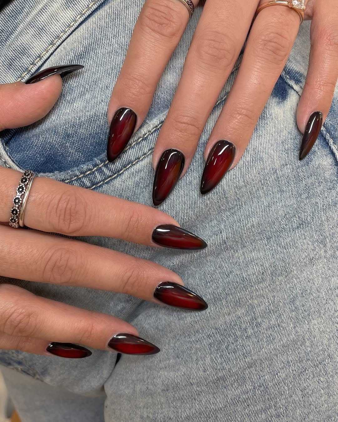 These nails blend deep cherry red and black to achieve a glossy, glass-like effect. They look effortlessly modern and sleek.