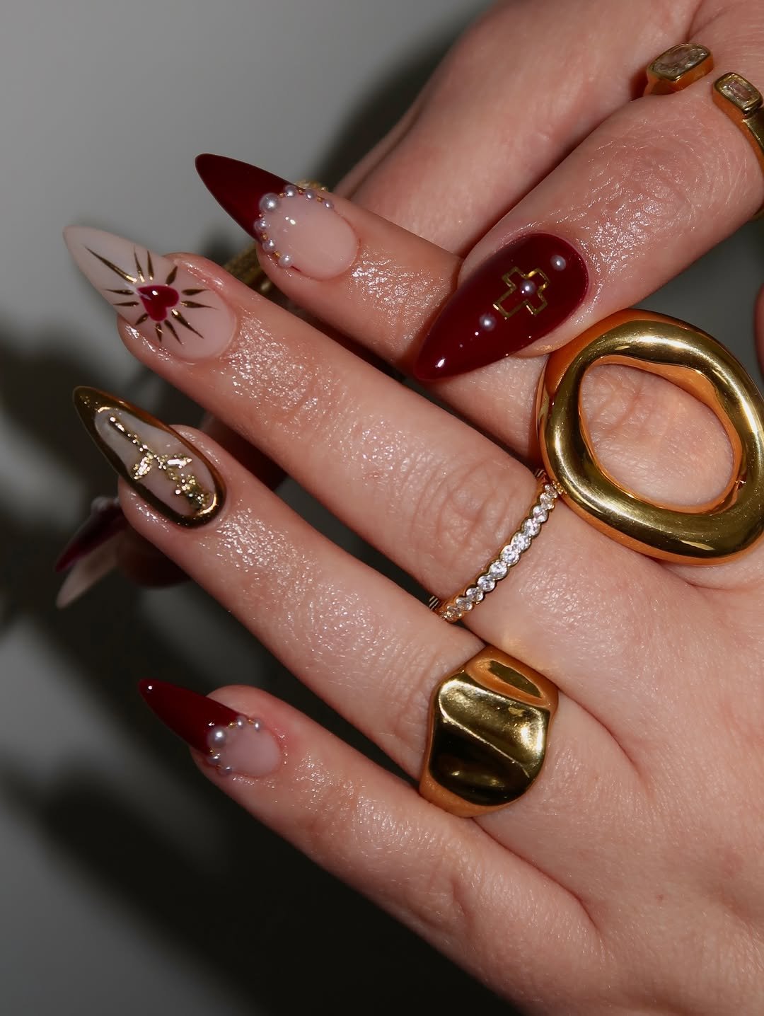 This design combines deep burgundy tones with intricate gold embellishments and pearl accents. The contrast between matte and shimmer gives the nails a royal, luxury finish.