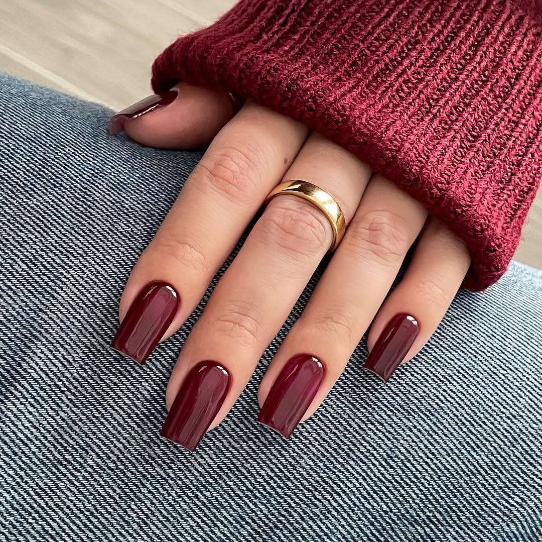 These nails bring the luxurious charm of velvet into a red manicure. The dark maroon shade with a soft shimmer feels plush and warm—ideal for winter.