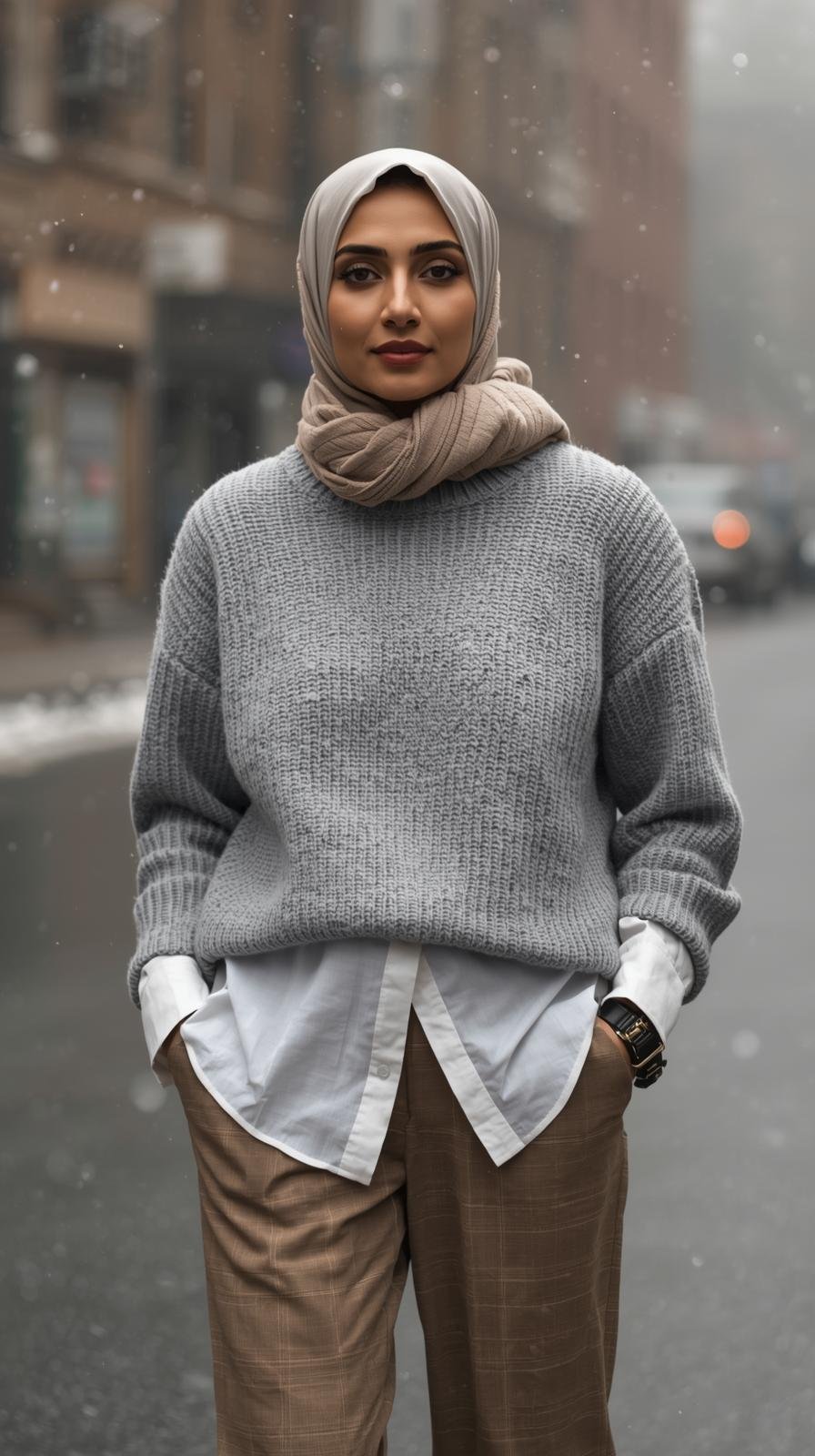 This Sweater Outfit blends a grey winter sweater with a white shirt and tailored trousers for a crisp layered effect. The Winter Sweater adds warmth and texture, while the shirt introduces structure — a perfect combination for work, errands, or everyday winter styling.