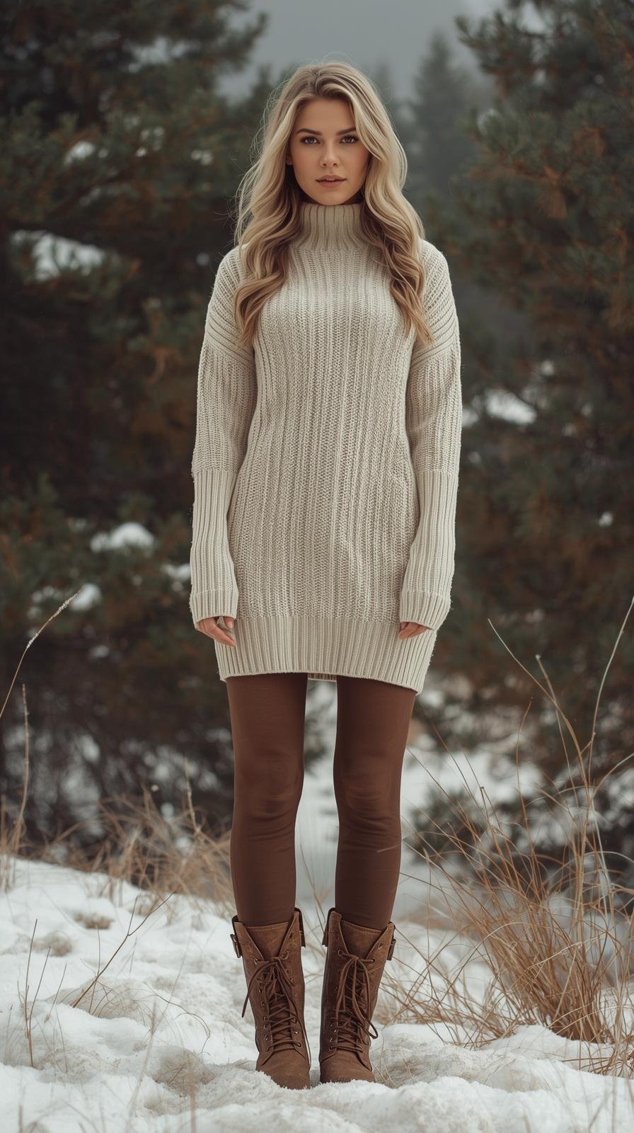 This Winter Sweater Outfit features a cozy oversized cream sweater dress paired with leggings and boots, making it perfect for cold outdoor days. The Winter Sweater’s soft, relaxed fit brings both comfort and style, while the leggings create balance.