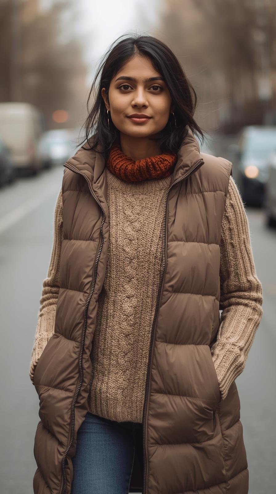 This casual Winter Sweater Outfit mixes a chunky cable-knit sweater with a warm puffer vest — perfect for winter errands or outdoor strolls. The sweater texture stands out beautifully under the structured vest.