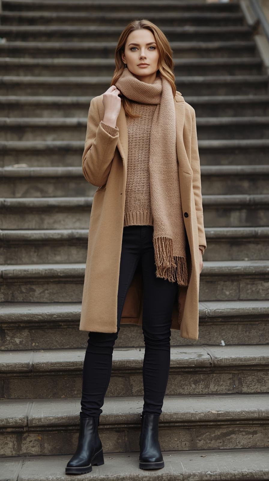 This Winter Sweater Outfit layers a textured knit sweater under a camel coat, finished with a thick scarf for warmth. This combination instantly elevates any Winter Sweater and makes the whole look feel luxurious.