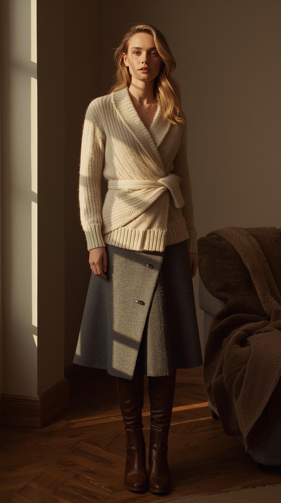 This elegant Winter Sweater Outfit showcases a wrap-style sweater paired with a structured wool skirt. The winter sweater’s draping creates softness while the skirt maintains refinement.