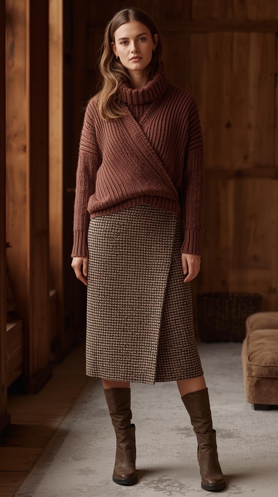 This warm-toned Winter Sweater Outfit features a wrap sweater paired with a patterned skirt, offering both texture and visual depth. The wrap-style winter sweater adds shape while the skirt introduces soft movement.