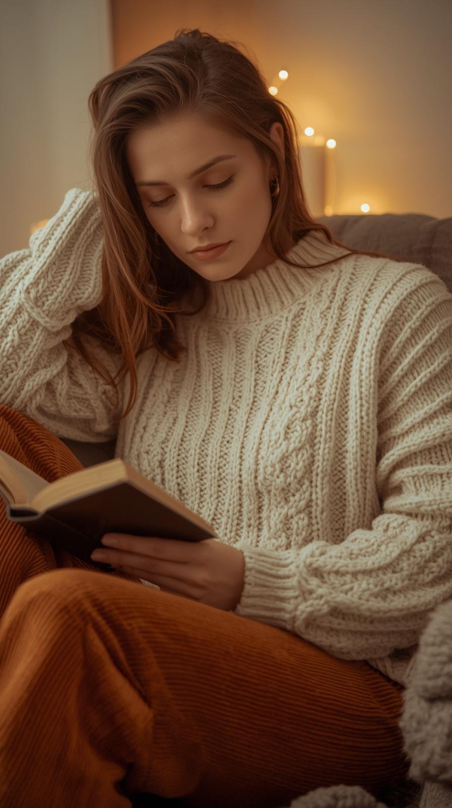 Layering soft socks or adding a textured throw blanket elevates the cozy feel for indoor settings. This sweater outfit is comfort at its finest.