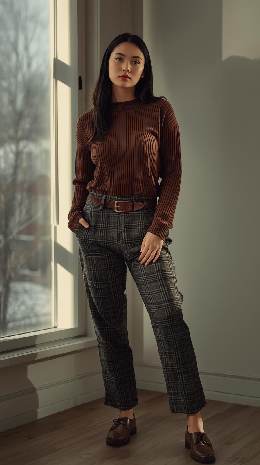 17. Chocolate Ribbed Sweater & Plaid Wool Pants