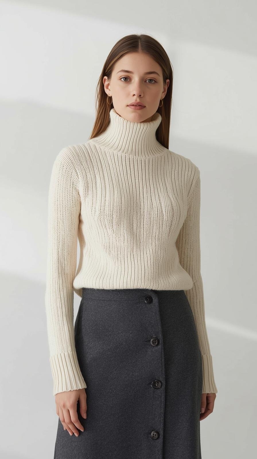 This minimal Winter Sweater Outfit pairs a cream ribbed turtleneck sweater with a charcoal wool skirt — a clean, elegant combination. The winter sweater adds warmth without sacrificing structure.
