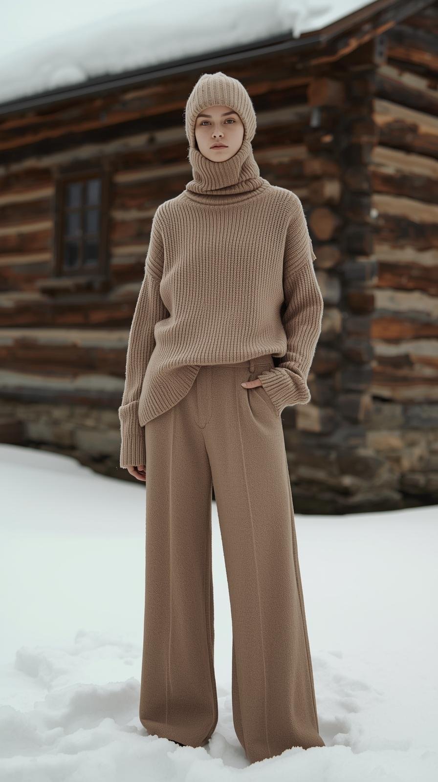 This editorial Winter Sweater Outfit features a ribbed mocha sweater with matching wide-leg trousers and a balaclava-style hood. The coordinated Winter Sweater palette feels luxurious and modern.