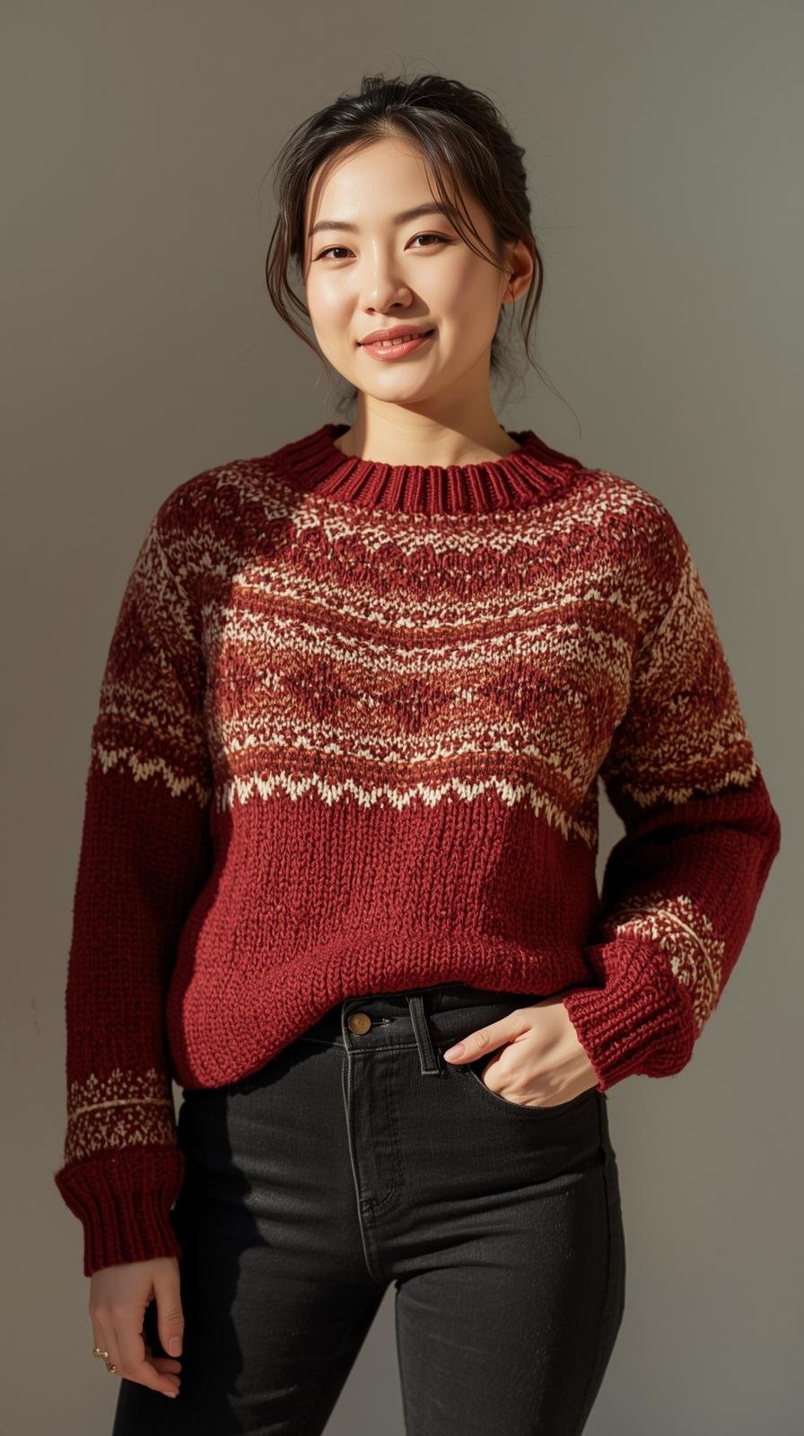 This cheerful Winter Sweater Outfit pairs a red Fair-Isle winter sweater with classic black jeans. The patterned knit gives it a festive and seasonal charm.