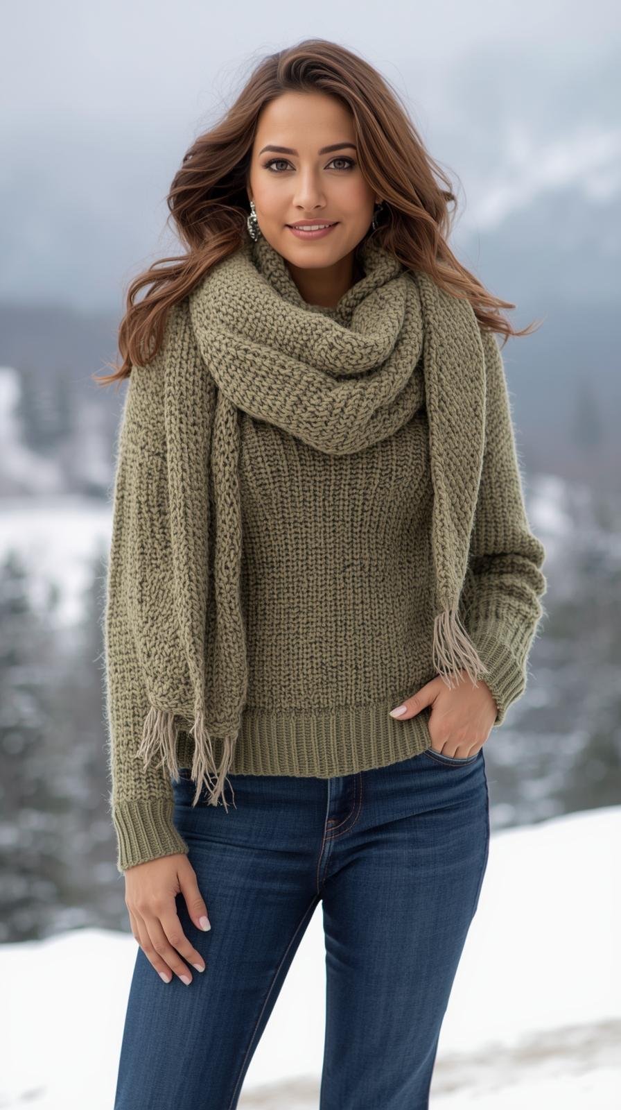This calming Winter Sweater Outfit highlights a sage green chunky sweater with a matching scarf and classic denim. The winter sweater tone feels refreshing against snowy winter scenery.