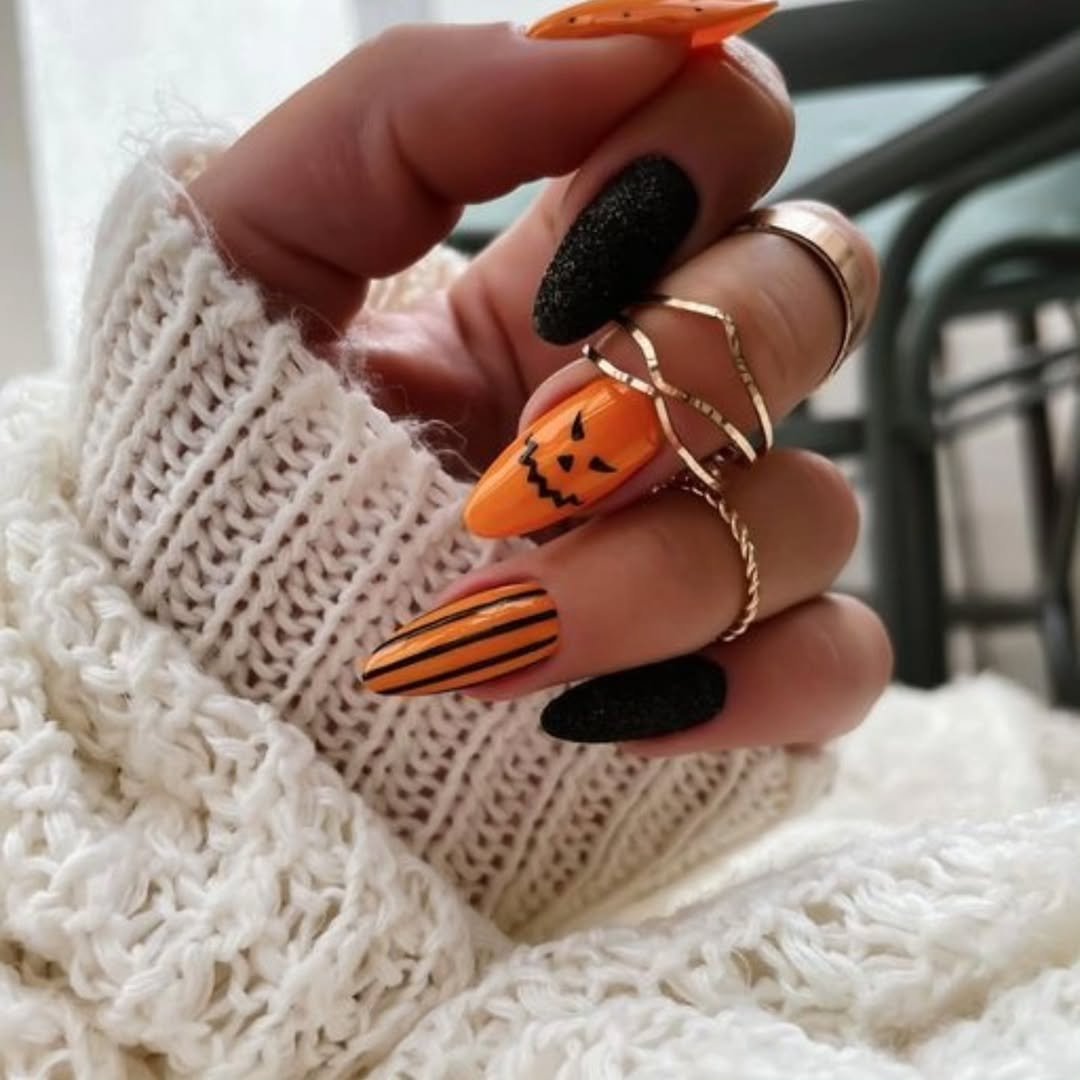 These nails bring a chic twist to classic Halloween orange. With glossy orange tips and jet-black matte accents, the pumpkin face detail adds just the right dose of spooky charm. The vertical stripes make the nails appear longer, giving a sleek and elegant vibe while keeping the Halloween spirit alive.