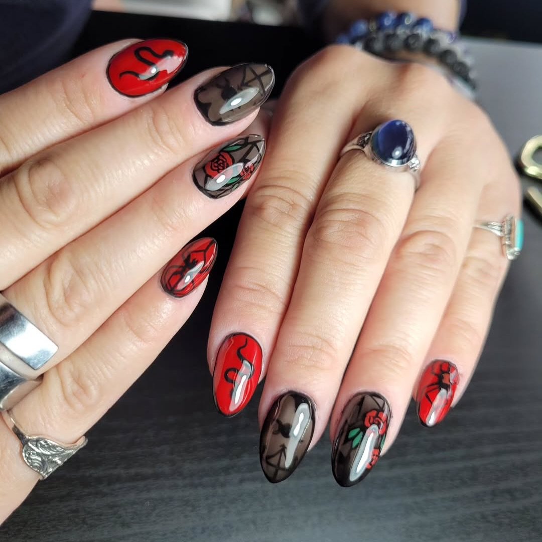These nails blend dark romance with horror elegance — deep red roses intertwined with smoky black bases and fine line art. The translucent brown undertones make each design look like stained glass, perfect for those who love moody detail.