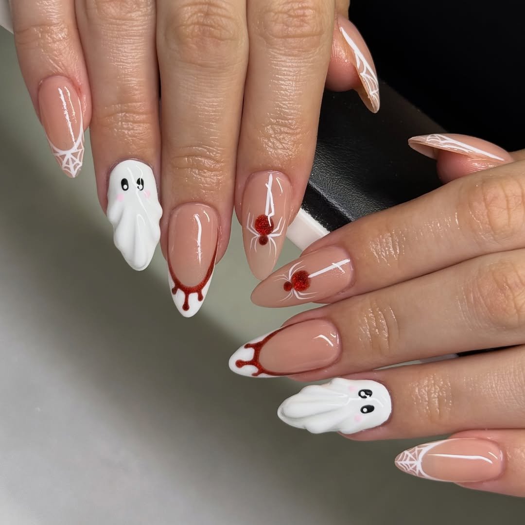 Cute meets creepy with these 3D ghost nails featuring red drips and spider web accents. The nude base keeps it classy, while the bold white ghosts add a playful spirit that feels unmistakably Halloween.