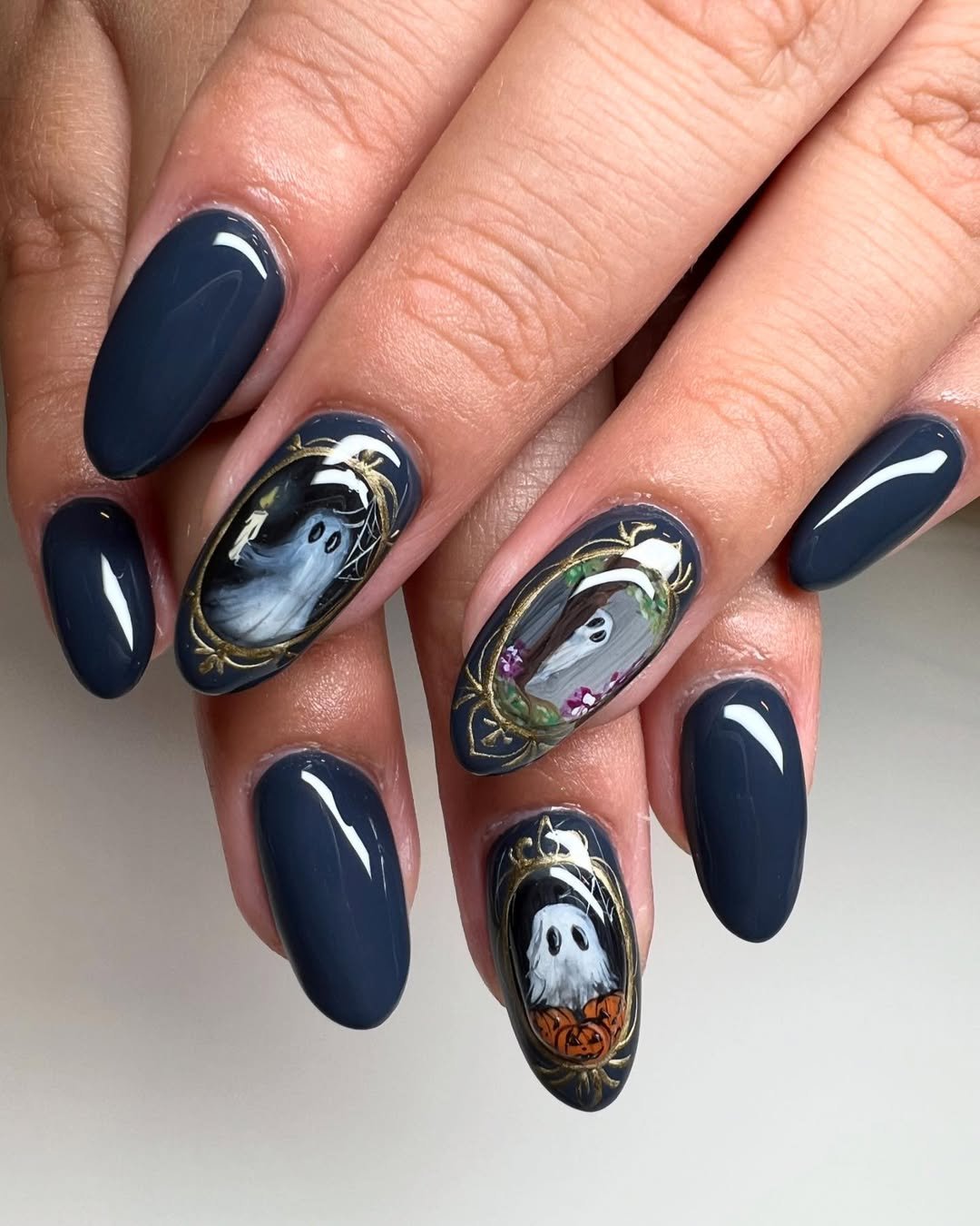 These nails look like haunted portraits come to life! With navy blue bases and framed ghostly artwork, this design feels like something straight out of a haunted mansion. The golden framing adds an ornate touch of sophistication.