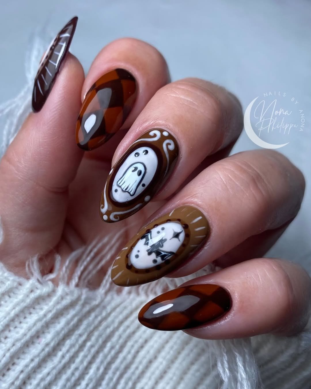 Channeling autumn warmth, these nails combine brown caramel tones with adorable white ghosts framed in retro, ornamental designs. The checker-pattern accent adds a cozy, nostalgic vibe.