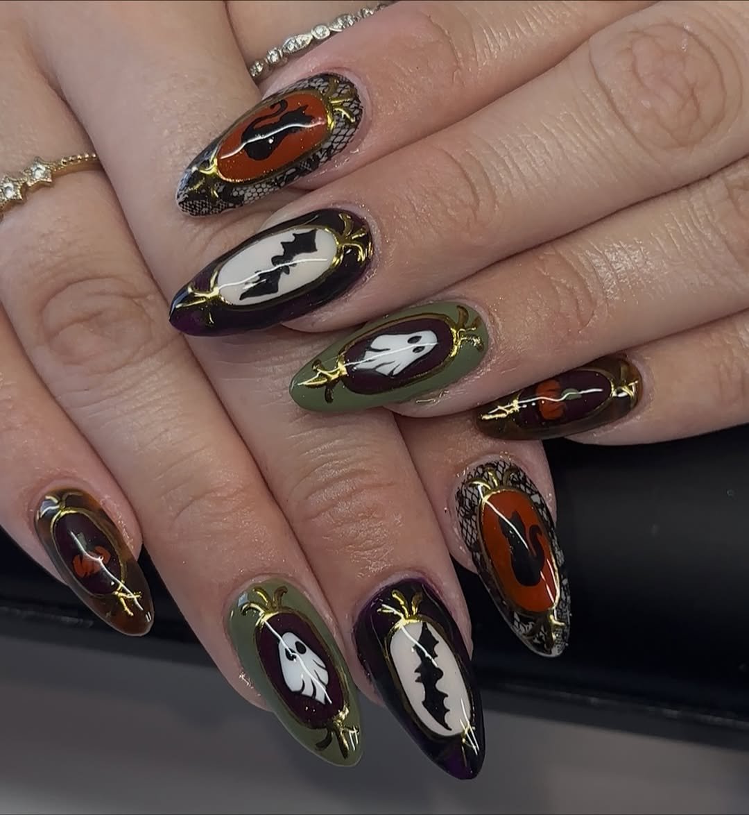This design feels like miniature works of art — each nail framed in gold, showcasing bats, ghosts, and pumpkins on moody green and purple backgrounds. The color contrast gives a bold, mysterious touch.