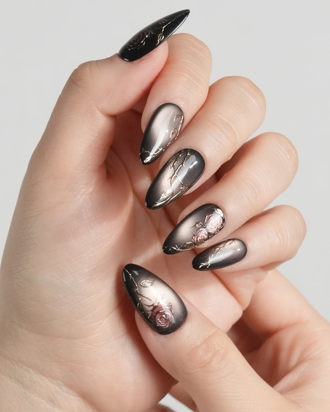 These black-to-taupe ombré nails with delicate pink roses blend gothic romance and Halloween charm flawlessly. The golden vines add just enough shimmer to make the art look ethereal.