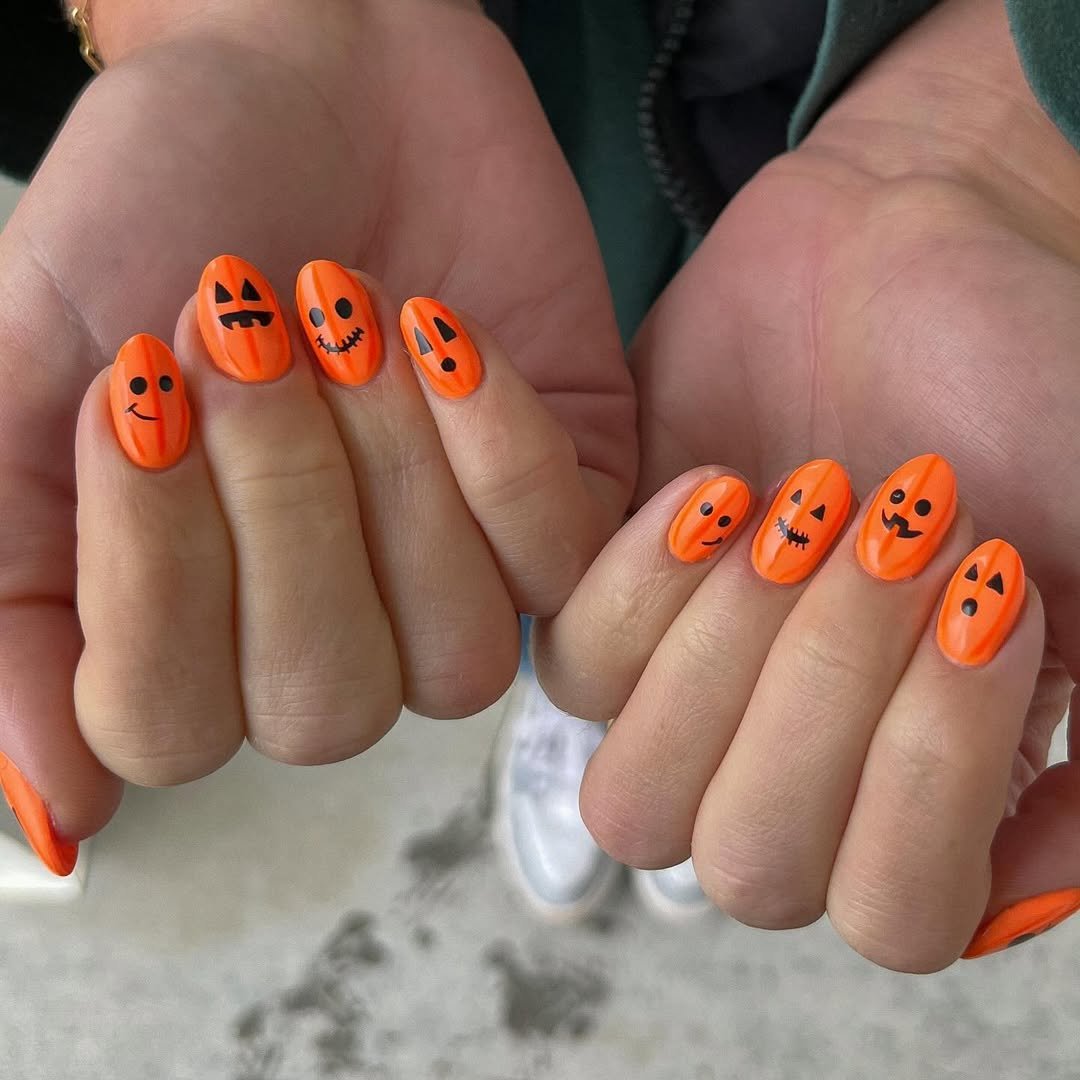 If you want to elevate this design, try using matte orange polish as the base to give the faces a soft, velvety finish. A thin coat of black gel polish will make each pumpkin expression stand out more crisply. For an extra twist, alternate a few glossy finishes to keep things dynamic.