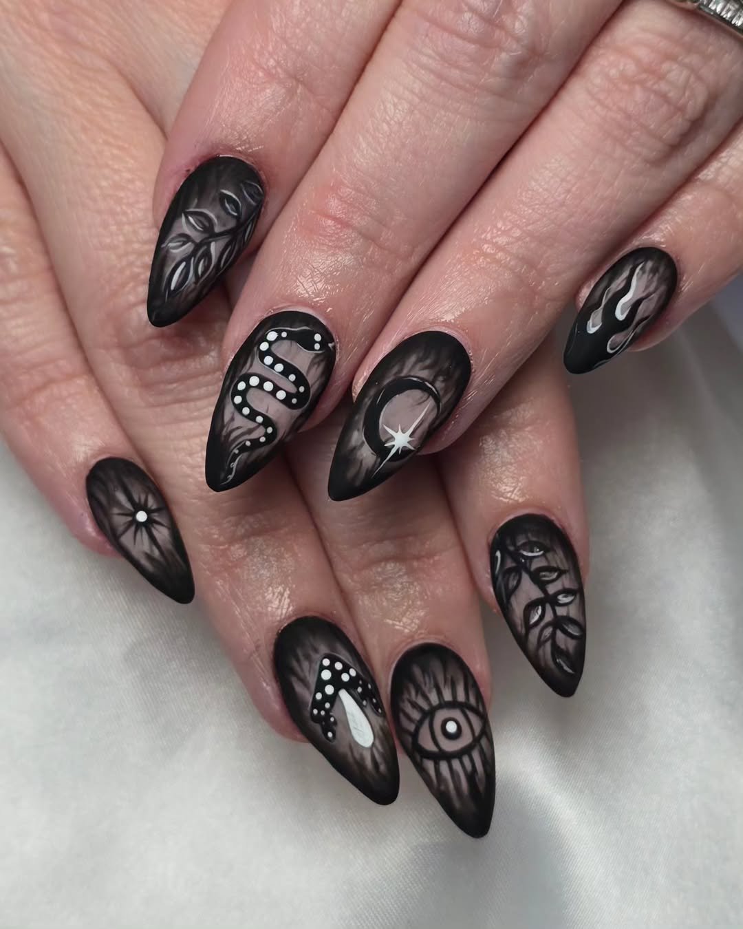 These nails channel witchy energy — matte black bases detailed with serpents, eyes, moons, and mushrooms. The smoke-like texture beneath adds an enchanting depth that feels magical.