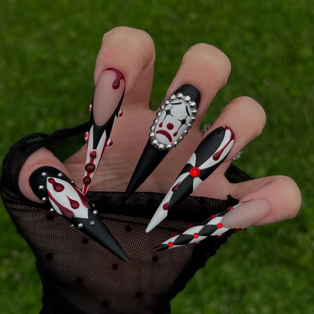 These dramatic nails are a haunting mix of elegance and horror. The black-and-white harlequin pattern paired with teardrop blood details and a sad clown centerpiece creates a theatrical, spooky vibe. The pointed shape enhances the bold, gothic feel, making them a total showstopper.