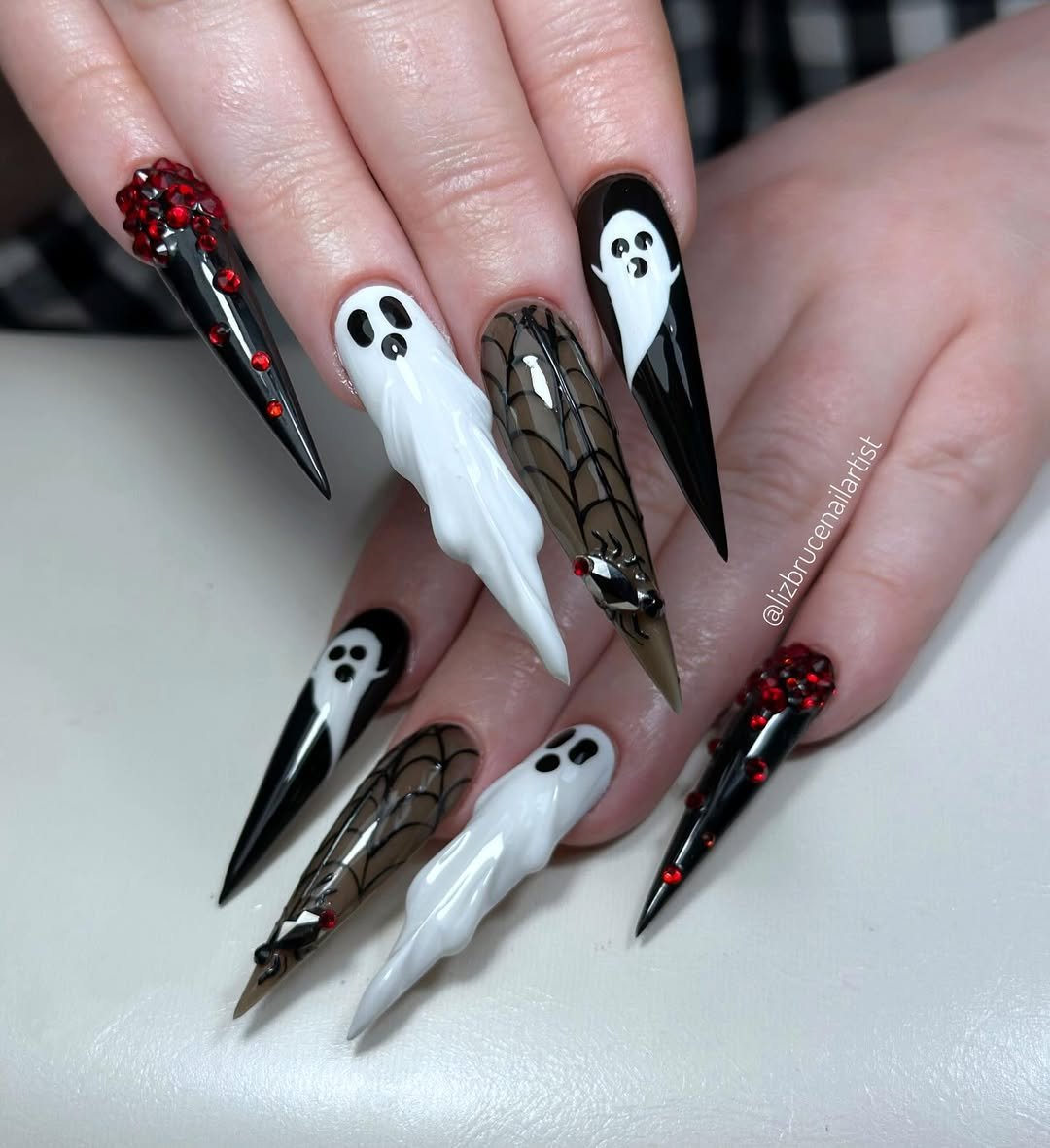 A modern twist on ghostly nail art, these long stiletto nails mix glossy white ghosts with black spider webs and sparkling red gems. The sleek contrast of black, brown, and red gives it a seductive Halloween energy.