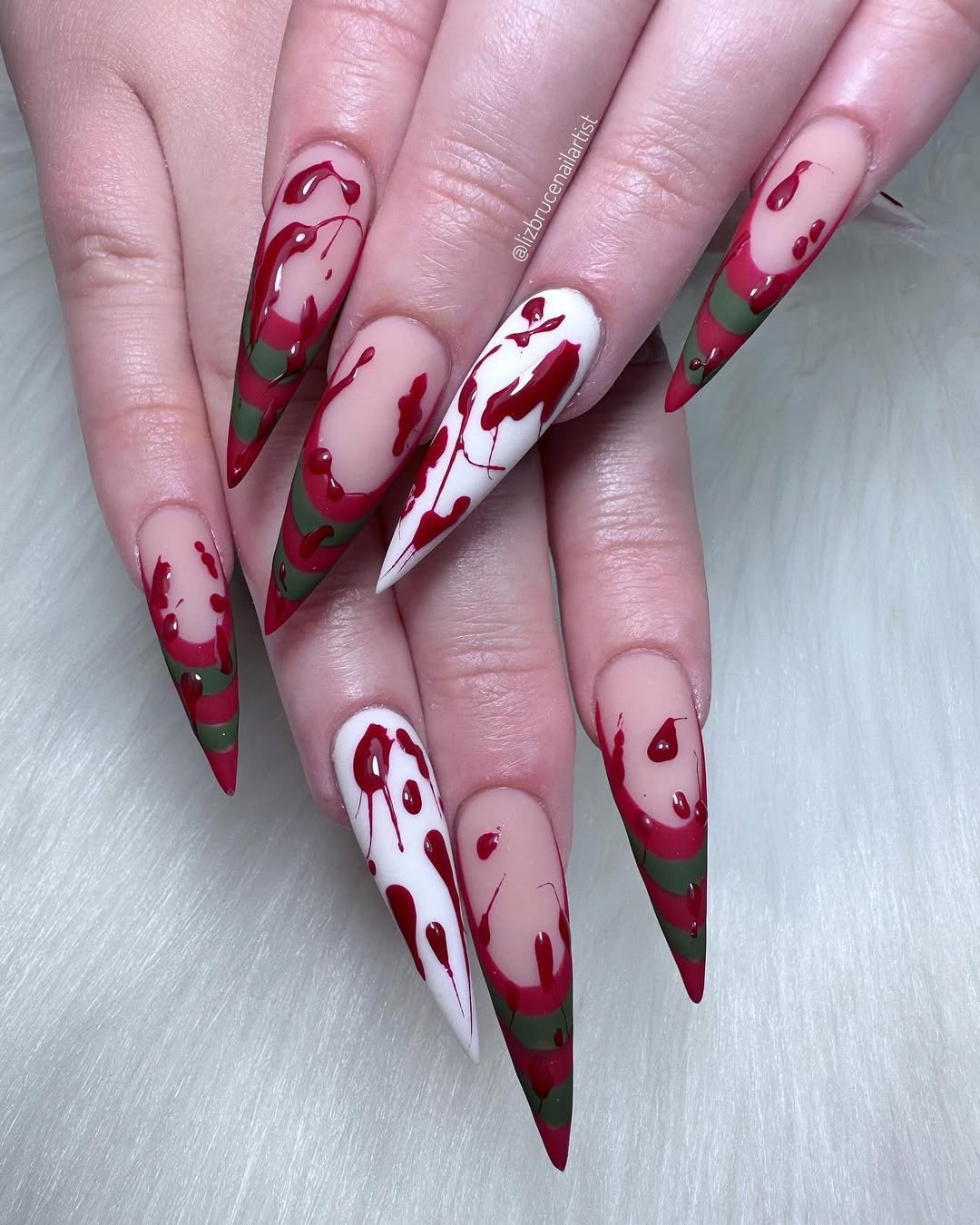 Nothing says Halloween like a nod to a horror classic. These nails feature blood-dripping details over red-and-green striped bases — a direct inspiration from Freddy Krueger’s infamous sweater.