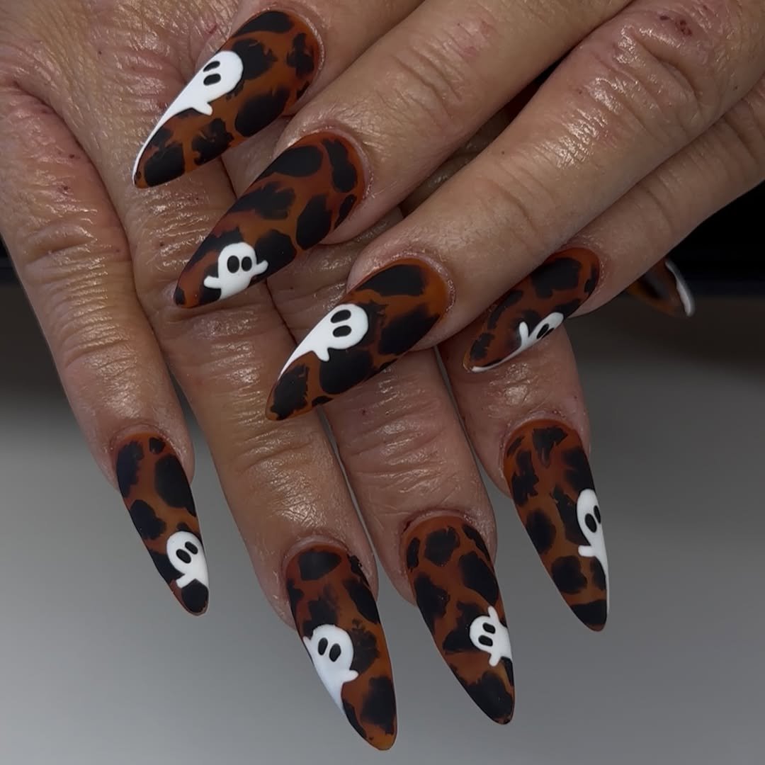 These nails mix wild animal print with cute Halloween spirits. The matte brown-and-black cheetah base gives off fall warmth, while the white ghost overlays bring a fun contrast.