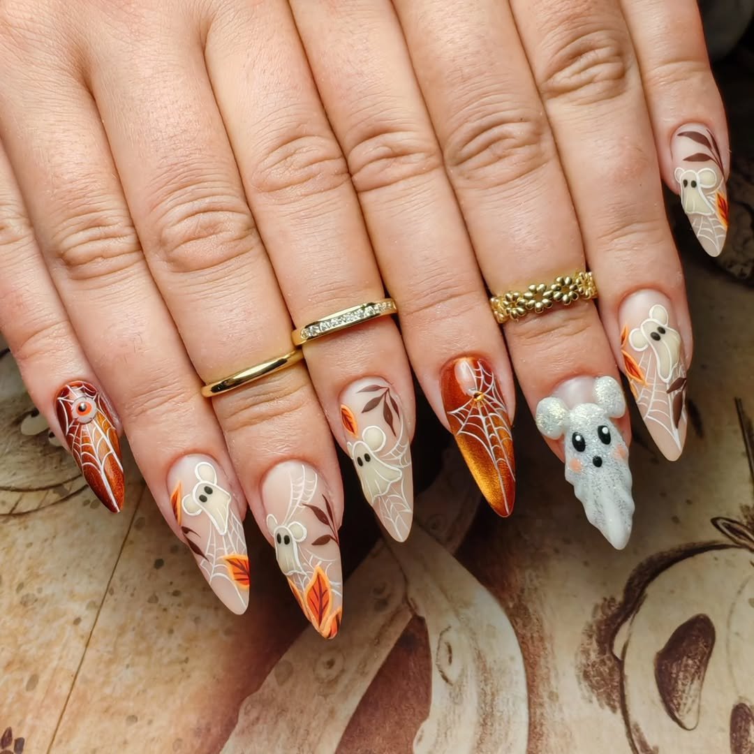 Cute and cozy meet spooky chic in these fall-themed ghost nails. Warm beige, orange, and brown tones blend with delicate leaves and spider webs, while one accent nail features an adorable 3D ghost.