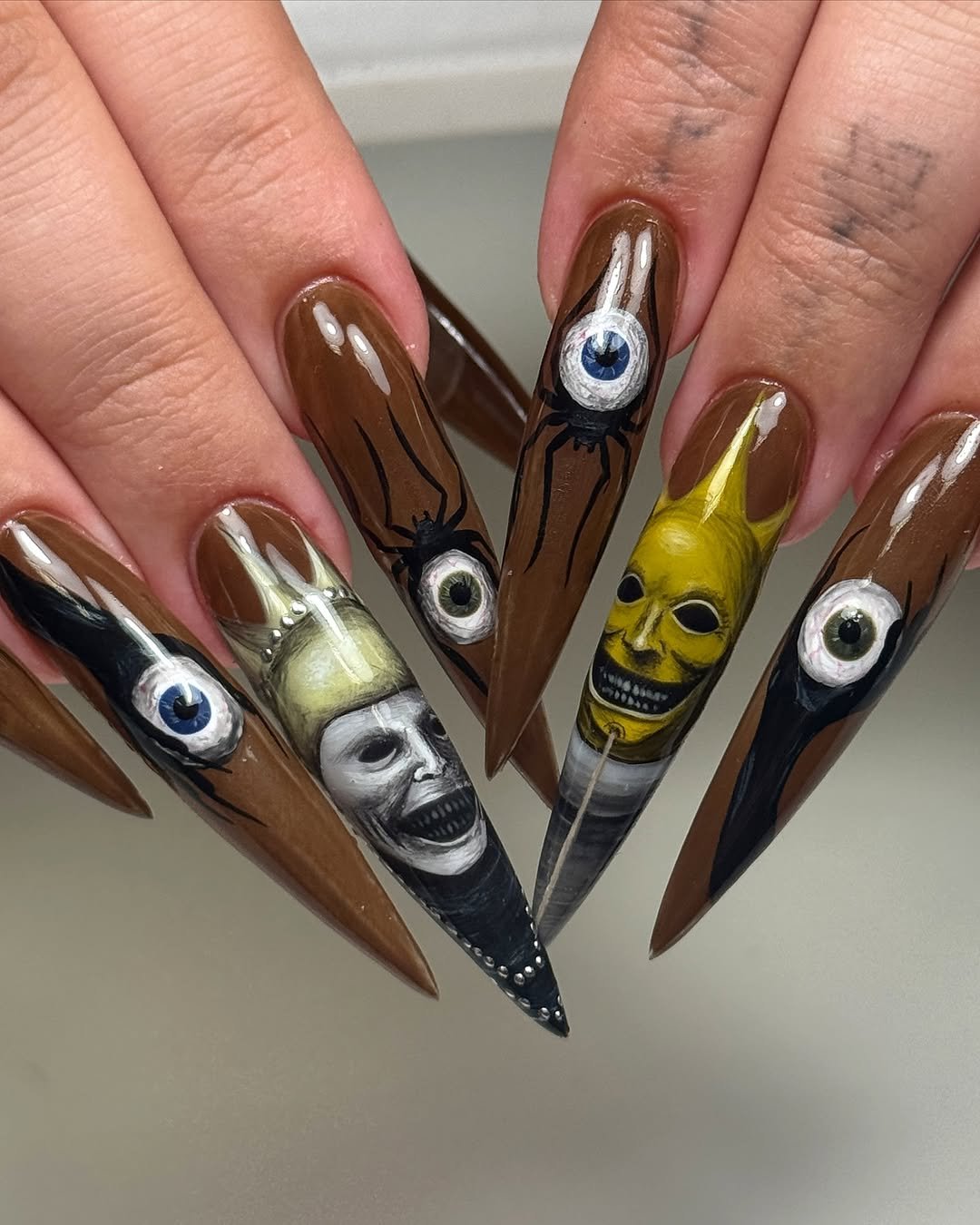 This ultra-detailed set elevates Halloween artistry to a new level. Each nail features different creepy faces, eerie eyes, and haunting tones of brown, black, and yellow. It’s like wearing your own horror gallery on your fingertips.