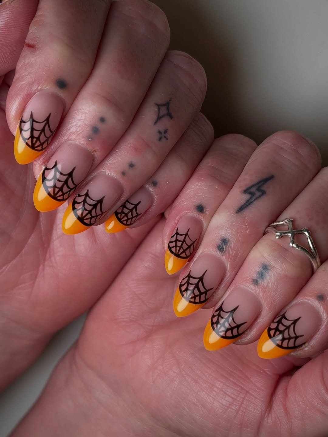 This design brings a fun, nostalgic touch to Halloween. The warm, yellow-orange French tips, paired with delicate spider webs, give a cheerful yet festive feel. It’s simple, classy, and perfect for anyone who wants Halloween nails without going full horror.