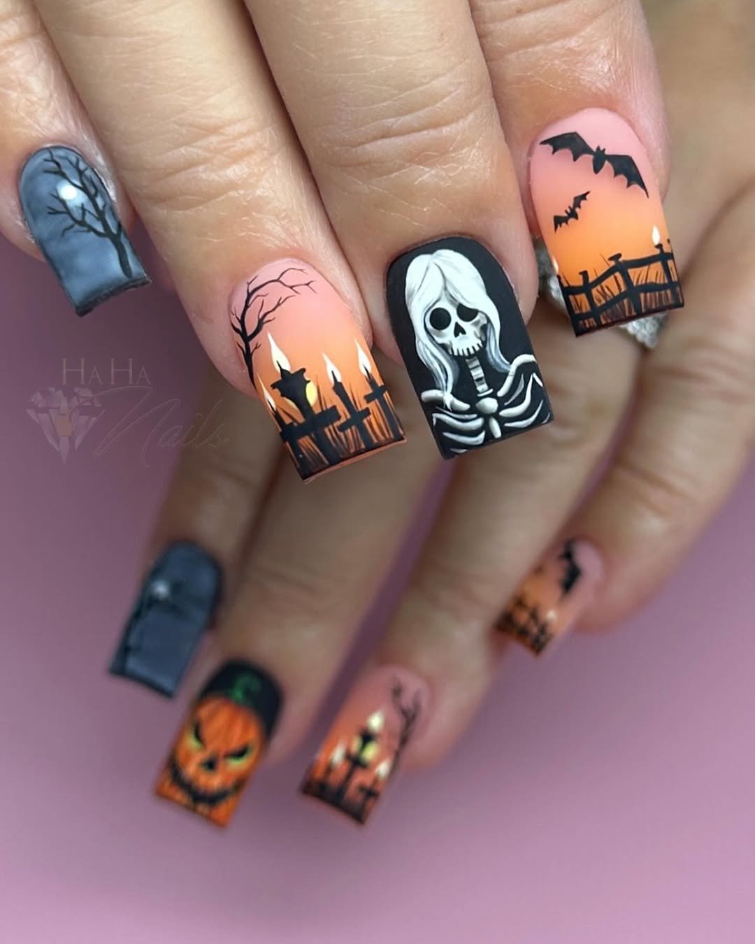 This look is a mini masterpiece—a hauntingly detailed graveyard scene painted in orange and black ombré tones. From eerie skeletons to bats flying across twilight skies, every nail tells a different story. It’s perfect for someone who wants art that doubles as a conversation piece.