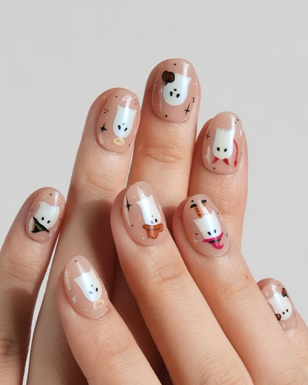 You can amplify the appeal by adding a sheer shimmer base or micro silver specks around the ghosts. Switching a couple of designs to tiny pumpkins or stars would also keep it interesting without breaking the soft aesthetic.