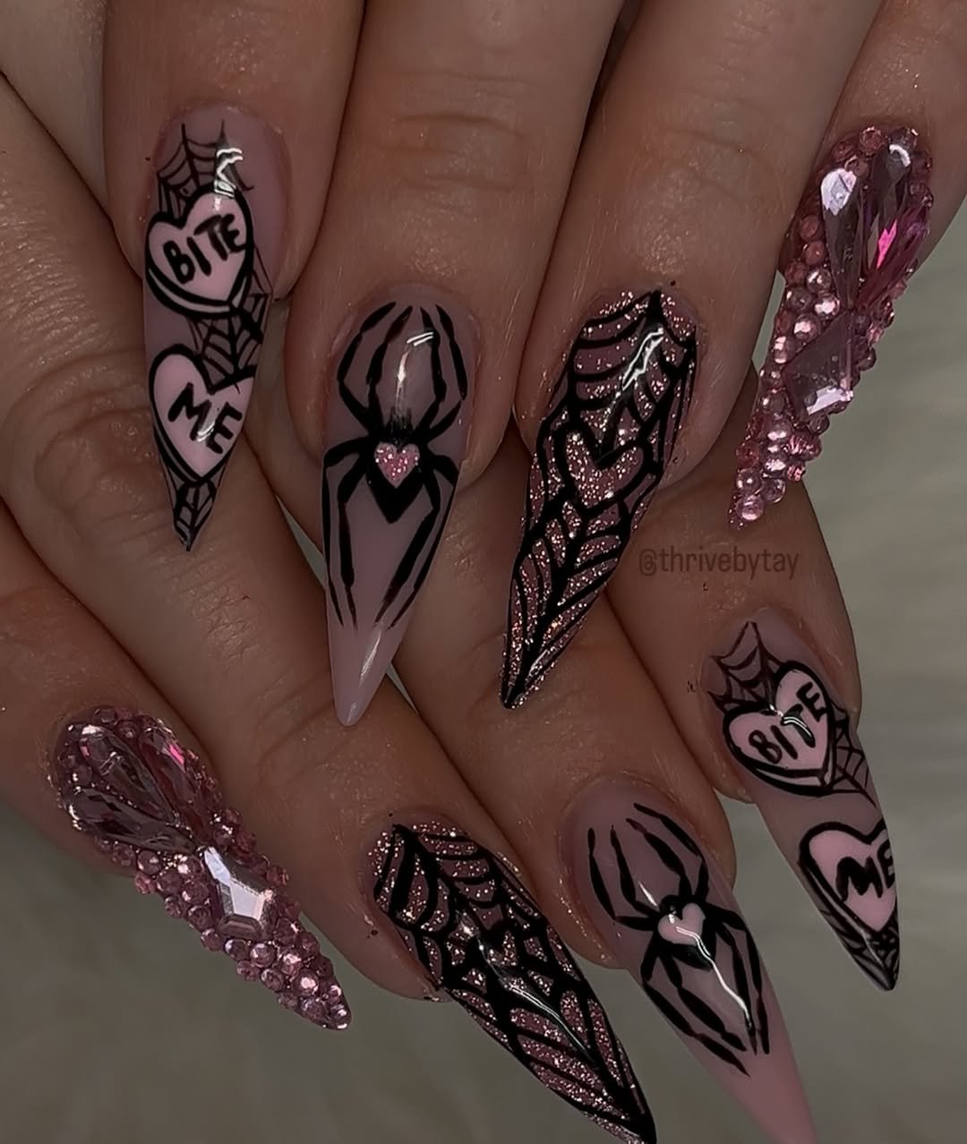 Who says Halloween can’t be glamorous? These pink spider-web nails are dripping in sparkle and confidence. With “Bite Me” hearts and detailed webs, this design takes spooky-chic to a whole new level. The gemstone accents add a luxurious twist that screams ‘glam queen’.