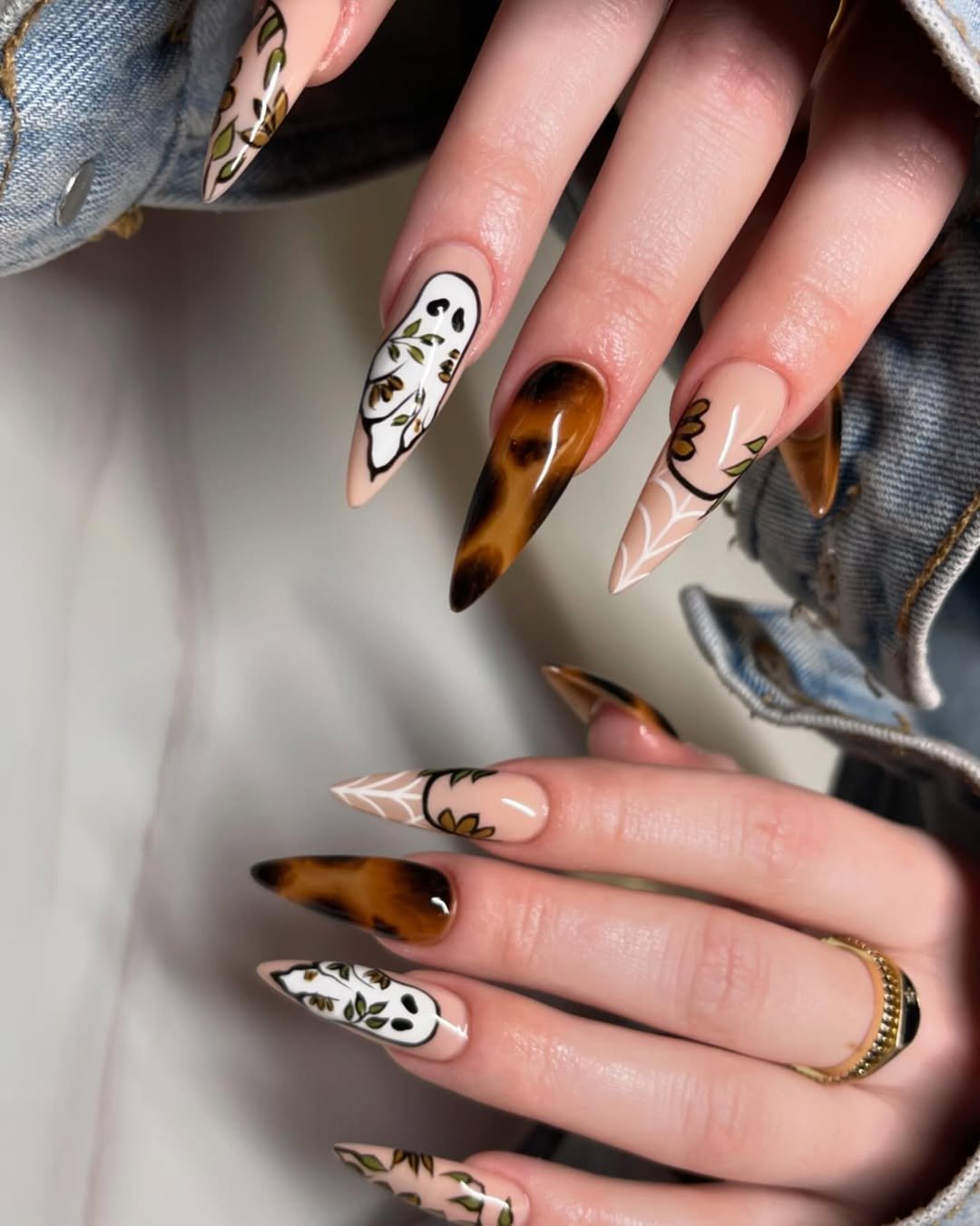 These nails blend earthy tortoiseshell tones with ghostly white accents for a sophisticated Halloween aesthetic. The brown-amber swirls add warmth, while delicate ghost and leaf details bring a refined seasonal charm.
