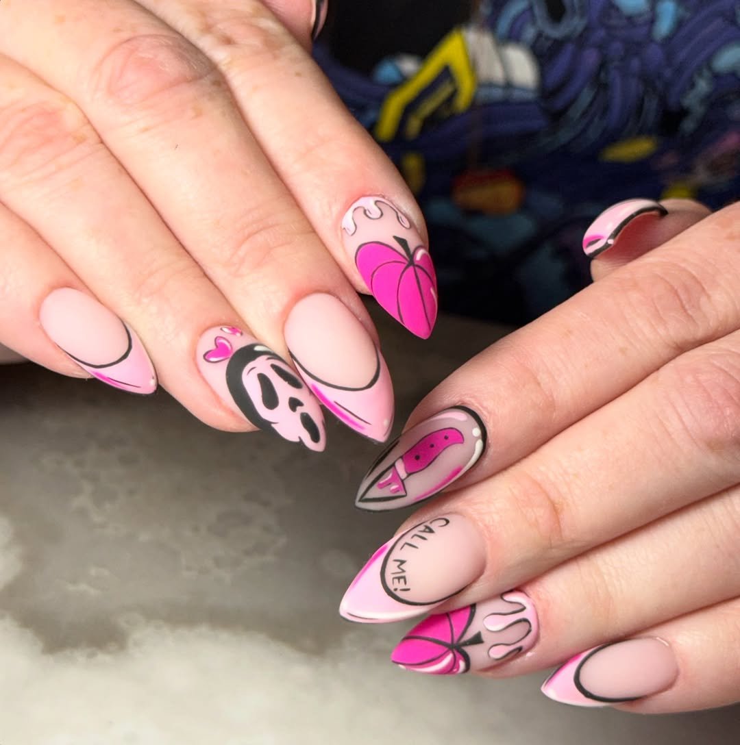 A bold pop of pink with Halloween flair—these nails are playful, edgy, and full of attitude. The soft pink tones mixed with black and white “Scream” masks make this design both cute and rebellious. It’s Halloween Barbie energy at its best.