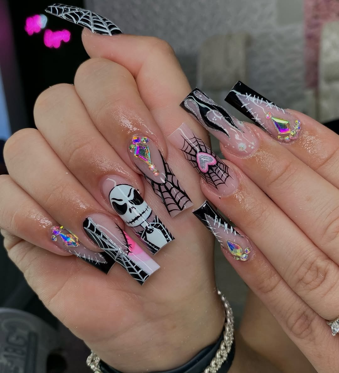 This design turns nails into a dark fairytale—complete with spider webs, stitched effects, and holographic gems that shimmer at every angle. The mix of black and nude tones gives the perfect Halloween high-fashion statement.
