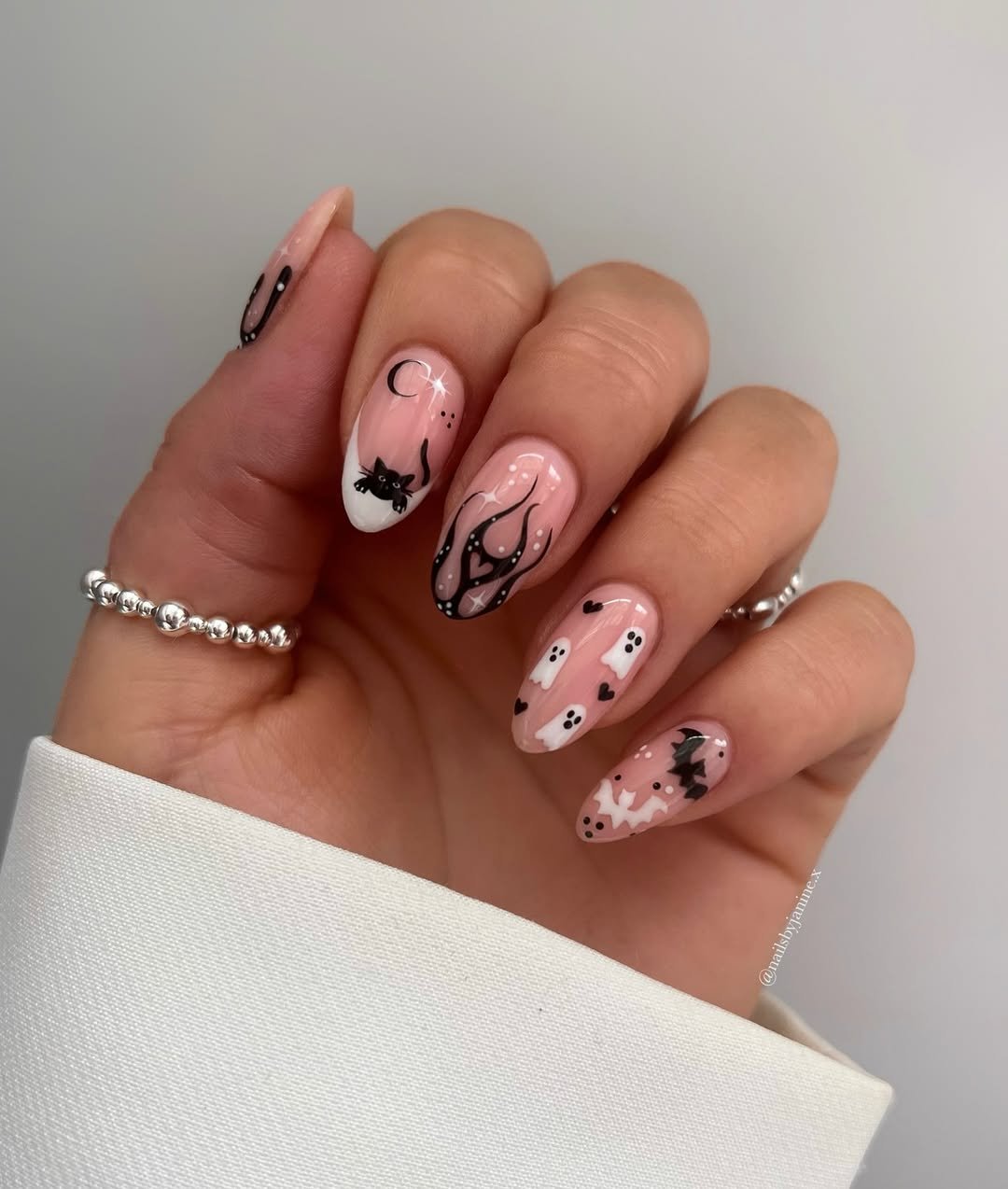 If you’re into something more whimsical than scary, this look is for you. A blush-pink base layered with delicate ghost, bat, and black cat motifs feels dreamy and playful. The flowy designs add motion, giving the illusion of the figures floating.