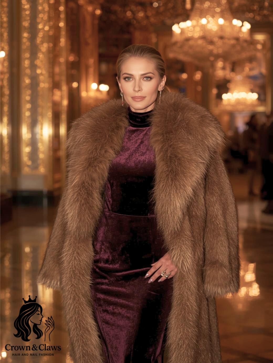 1. Burgundy Velvet Gown with Luxe Fur Coat